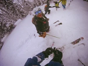 During the tour, I was amused at the pace set by ‘The Ossies’ as they were called, who barely gave the guide a chance to stay in front, and consequently we found our faster members of the group looking forward to swapping down towards the back half of each day. They just didn’t let up, and reports were that if you weren’t at the bottom within seconds of their outrageously paced arrivals, you weresighed at. This is despite the time they collectively lost hunting for skis and pulling each other out of tree wells or from cliff jumps gone wrong.