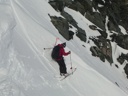 Once the heli flew off, we had to carefully click on our skis or boards in the narrow space that the heli vacated, and then Barney, our guide edged us towards the entry point for a 43 degree powder chute.